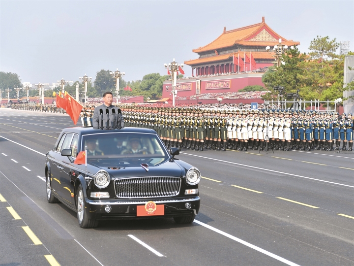 雄壯的軍樂聲中,習近平乘車沿著寬闊的長安街,依次檢閱13個徒步方隊、1個戰旗方隊、22個裝備方隊。受閱部隊軍容嚴整、意氣風發,鐵甲戰車整齊列陣、威風凜凜。這是人民軍隊奮進建軍百年的嶄新亮相,這是中華民族捍衛世界和平的堅定宣示。